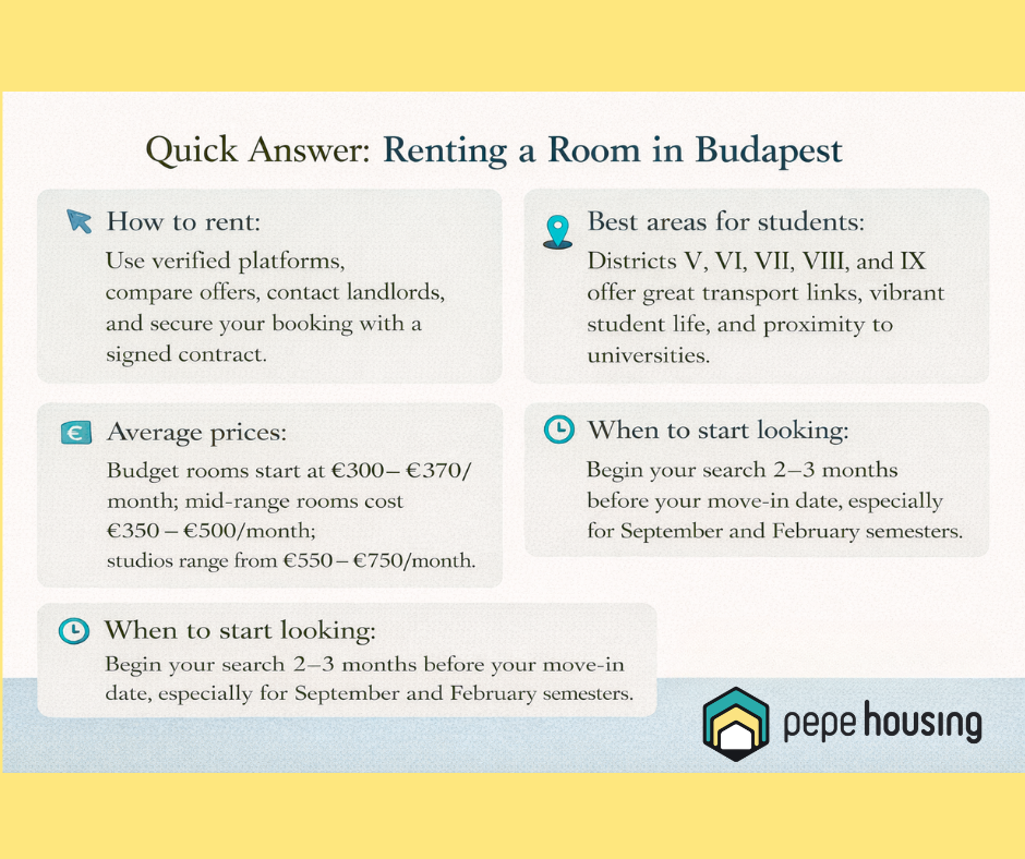 Find safe, affordable student accommodation in Budapest. Learn when to book, average prices, best areas, and how to rent a best room in Budapest in 2026. Moving to Budapest for your studies is exciting -but finding the right place to live can feel overwhelming, especially if you're unfamiliar with the city. With thousands of international and Erasmus students arriving each semester, the rental market gets competitive quickly.