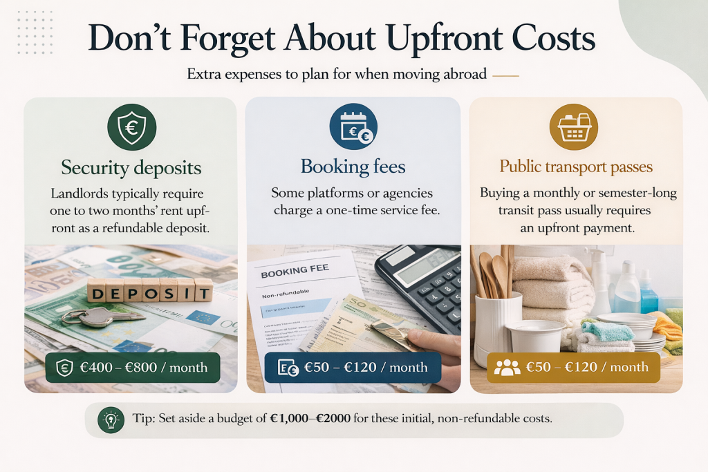 Budgeting for rent is obvious. However, many international students forget about the upfront costs required to secure an apartment and settle in. Make sure you have funds set aside for: