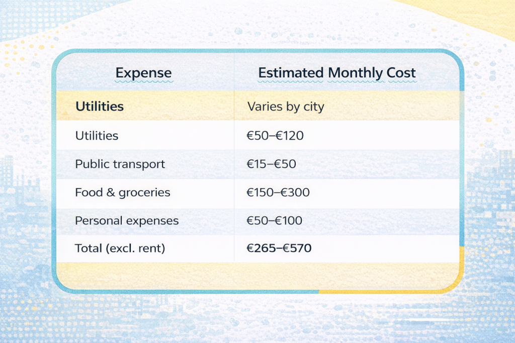 Depending on the city and your lifestyle, these additional costs can add up to €50 - €200 per month. Knowing this upfront helps you choose the right accommodation and avoid running short mid-semester.